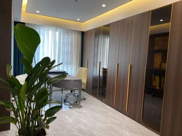 这是电视背景墙后面的空间,作为书房没有任何影响。定制了一排的储物柜,储物空间非常强大,加上玻璃门,显得比较时尚。也是选择了无主灯的设计,加上旁边的天堂鸟植物,可以起到很好的装饰效果,更显得有家的味道。