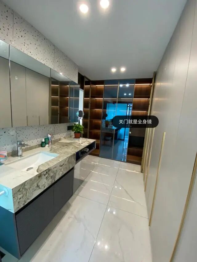 这是衣帽间,同时把卫生间的浴室柜独立分开出来,这样设计其实不是那么常见,而且玻璃设计很成功,可以更为灵活使用。全屋的柜子都是定制的,质量与做工都还不错,细节处理也比较好。