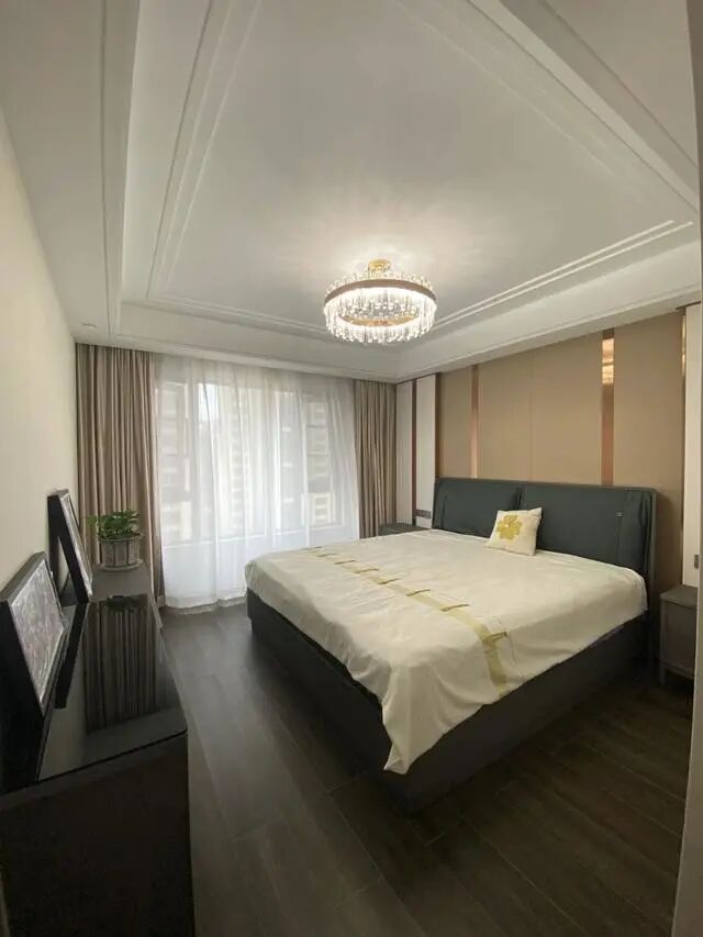 这是主卧,窗帘后面有独立的阳台,晾晒衣物都方便很多。床头背景墙加了金属线条搭配,更增加了时尚感。其实,看着有点类似酒店客房的效果,一张双人大床,左侧布置了壁柜,加上梳妆台,可以很方便使用。顶面安装的水晶吊灯,很轻奢。