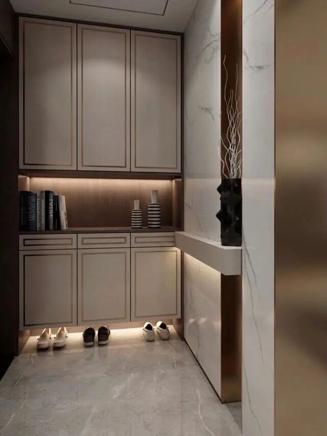 从入户进来有个独立的玄关,根据玄关空间设计了上下两层直接到顶的鞋柜,可以提供大量的储物空间。鞋柜最底下留空位置,可以放一些常穿的鞋子,不需要经常打开柜门那么麻烦。并且设计了感应灯,可以起到增加照明的作用,特别合适。加上柜门无拉手的设计,简单好看,很是让人喜欢。家里如果不懂如何设计鞋柜的话,可以参考一下,让人进来眼前一亮,特别满意。