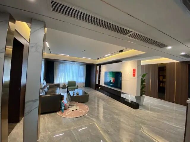 客厅整个空间给人的感觉非常宽敞,大气,看着有点类似样板房的感觉。做了电视背景墙,大理石的材质很有质感,并且把电视机直接悬挂起来,坐在沙发与家人一起看看电视,很幸福。顶面安装了中央空调,加上无主灯的设计,特别让人羡慕。地面选择铺贴灰色瓷砖,很耐脏,与整个空间刚好搭配起来。