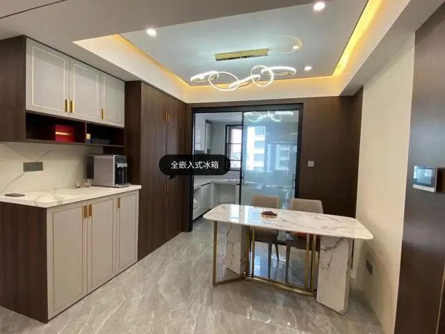 这是餐厅区域,布置了一张岩板餐桌,款式时尚又显得大气,看着都很喜欢。左侧布置了餐边柜,可以提供大量的储物空间,特别实用。而且还设计了嵌入式的冰箱,显得比较隐蔽,更有设计感。后面玻璃移动门进去就是厨房了,煮好的饭菜可以很快端出来,方便用餐。到时候入住,一家人坐在一起用餐,真的很幸福哈。