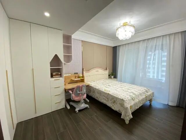 这是女儿房,设计了“L”型衣柜,可以增加蛮不错的储物空间,而且预留了位置作为书桌柜,可以方便家里小孩写作业或者看书。空间还是比较宽敞的,给人的感觉很舒服,显得温馨,尤其是地面选择木地板,没有瓷砖那种冷冰冰的感觉。